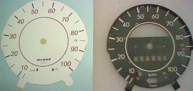 28th September 2004: This week: oil change, new dash being installed (aluminium plates, new redesigned face for speedo and Pivot tacho properly installed) and new front struts. The new speedo face can be seen below. I scanned the old one on the right and used Photoshop to match the Pivot gauge. Photos of the dash will be up within 2 days. On Thursday I'm taking my bumpers to Cardiff Electroplating in Newcastle to be rechromed. Before and after photos will be taken. And new rear tyres will need to be purchased soon.